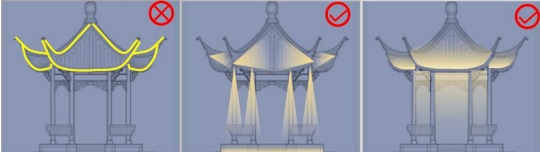 典型问题4:不注重灯具隐藏及防眩处理,白天对建筑、园林的观赏效果产生了不利的视觉影像,夜间对周边行人产生了不同程度的光侵扰。对此,《规划》要求应注重照明设施的造型、外表面材质与区域风貌的整体协调性,尽量选择小型化、进行了隐藏式设计及防眩处理的灯具,选择合适的照明安装位置,并进行精准投光,尽可能在照明设计中做到“见光不见灯”。