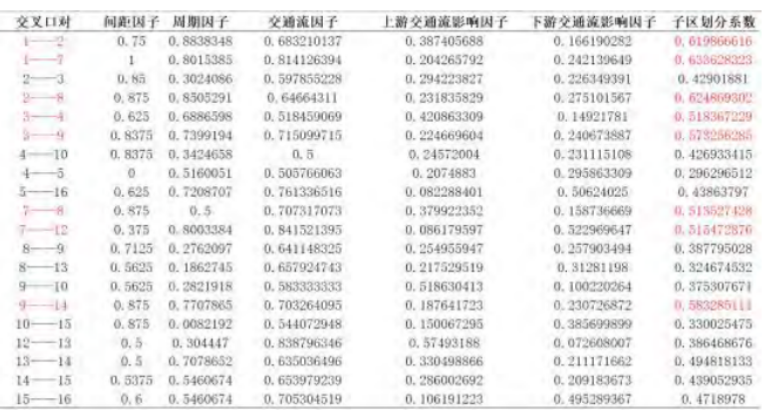 。当交通流离散影响因子越大,则越需要将两相邻交叉口划分进同一子区。将以上影响因子应用至前文中的软集合理论及信息量权数法中,得到子区划分结果: