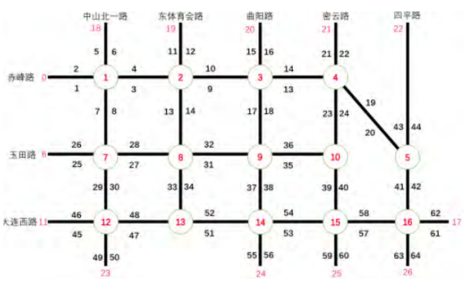 本文仿真案例研究区域主要道路由四平路、赤峰路、玉田路、大连西路、中山北一路、东体育会路、曲阳路、密云路等路段及其周边地区组成。将卫星云图中的交叉口及流入流出口采用红色数字编号标定,道路路段采用黑色数字标定。将卫星云图转化为易于分析的形态,在交通控制研究过程中我们通常将其转化为路网图的形式,具体抽象图如下图所示: