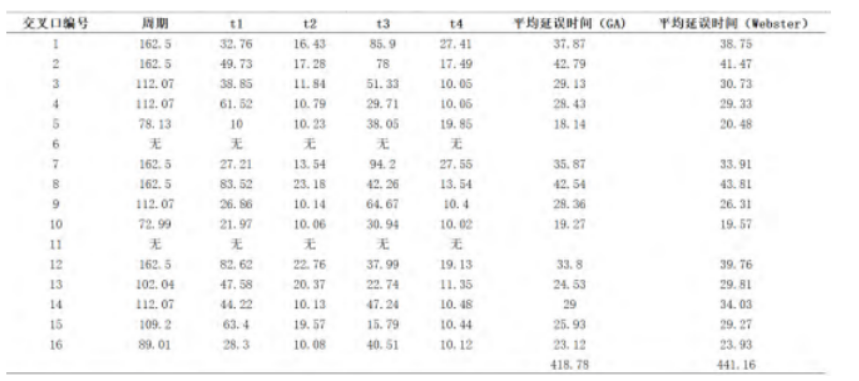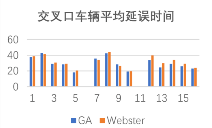 由对比结果可见大部分的交叉口在采用遗传算法计算得到的配时方案后,相比于传统的Webster定时算法,对车辆平均延误时间的减少效果更好,更能够缓解城市的交通压力。