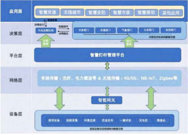 设备层的内部部分设备可进行局部的数据传递,杆与杆之间的智能网关可组成局域网,也可以通过有线或无线方式通信,部分终端可通过智能网关进行局域网的互联。