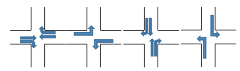 在交通控制中,为了尽量避免交叉口上几个方向的车流发生冲突,保证交通流的顺畅和车辆的安全,通常会采用分时通行的方法,即在一个信号周期的某一个时间段,交叉口信号灯为绿色,对某一个方向上的或某几个方向上的车流给予其通行权。在一周期内,交叉口上某一支或几支车流获得通行权的方式称为相位。以下图作为示例,其中箭头方向即为车流运动方向: