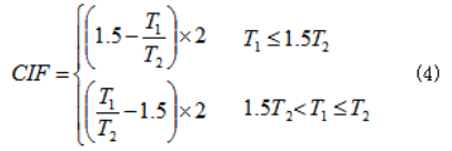 (2)周期影响因子:当相邻交叉口经过计算后的最佳周期较为接近时,两者具备较好的协调控制能力。对于两最佳周期相差较小的交叉口,可以将两者的周期调整为相同或者成倍数关系以进行协调控制,其具体公式如下: