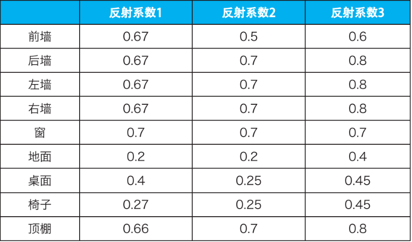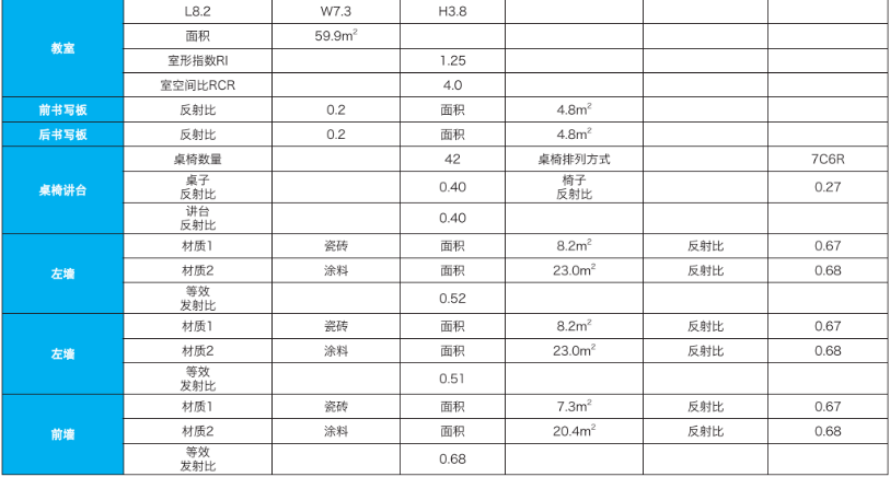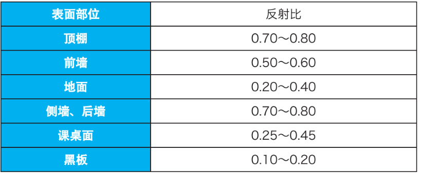 评估墙面或者窗帘的反射系数对UGR的影响,根据《GB50099中小学教学楼设计规范》中规定,教室墙面反射系数限值如下。