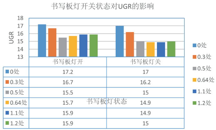 从上图可以看出,书写板灯关闭状态下,UGR呈下降趋势。以1.2m处UGR值变化来看,下降5.7%。