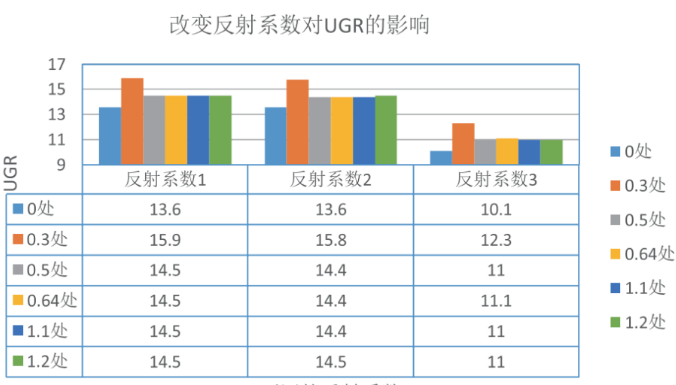 从上图可以看出,环境墙面的反射系数对UGR的影响较大。以1.2m处UGR值变化来看,以上述反射系数3设置相较于反射系数1设置时,UGR下降24.1%。