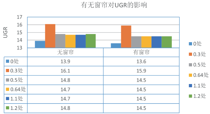 从上图可以看出,有窗帘时,UGR相较于无窗帘时要低,本案例中,窗户玻璃反射系数为7%,窗帘反射系数为70%。以1.2m处UGR值变化来看,下降2%。