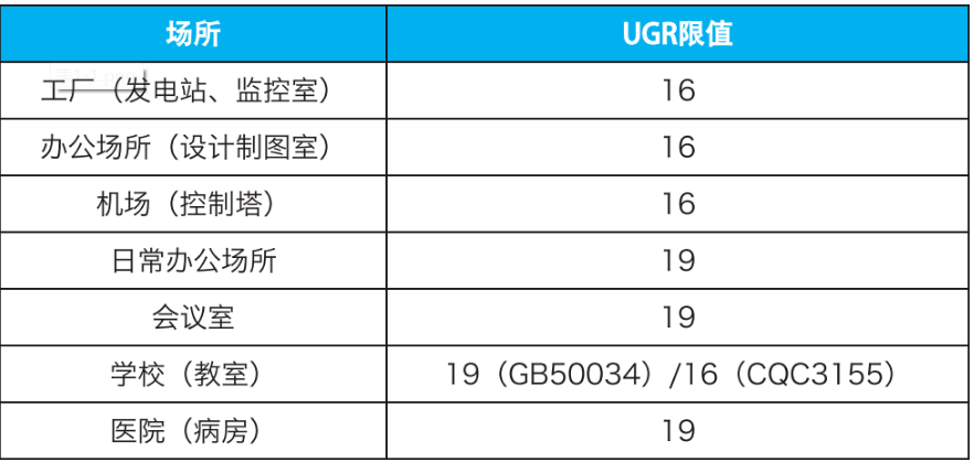 灯具照明应用中,UGR值不同,照明效果差异明显,从而带来的视觉和心理差异也较大,按照人们对眩光值的主观感受有如下经典划分。以下列表格中列举了CIE规定的几类场所的UGR限值: