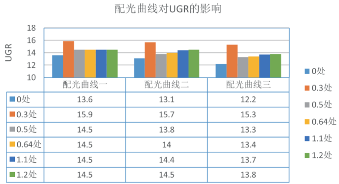 从上图可以看出,配光曲线二对UGR影响不大,配光曲线三对UGR影响较大,相于配光曲线1来说,UGR下降4.8%。