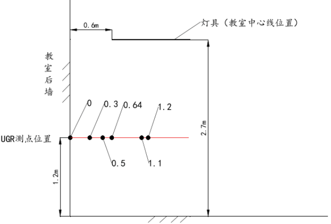 参考《GB50099中小学教学楼设计规范》《CQC16-465199-2020教室优质照明光环境认证规则》《DB31T539-2020中小学校及幼儿园教室照明设计规范》等标准,确定UGR测点位置,最终DIAlux模拟测点为0m、0.3m、0.5m、0.64m、1.1m、1.2m六个位置。其位置如下图: