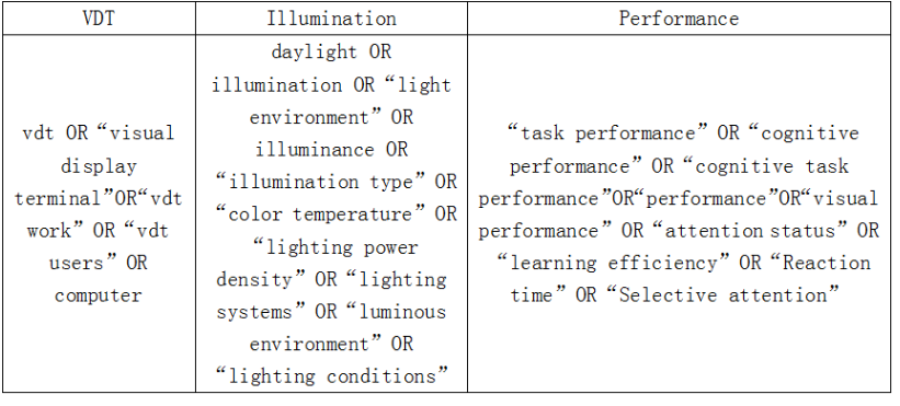 以主题词“照明(illumination)”、“视觉显示终端(VDT)”和“绩效(performance)”为基本条件,检索Google Scholar、Web of Science和SAGE Journals等数据库中2015年至2020年8月期间所发表的文献,检索到与主题紧密相关的文献36篇,全部检索词见表1;在中国知网、万方数据库等以“照明/光环境”、“VDT”和“绩效”进行主题检索,共检索到文献5篇。国内外文献总量为41篇,对所有通过筛选的文献进行了研究方法和影响效果的分析,考虑到不同光源对人的绩效影响有差异[15],且发光二极管(Light Emitting Diode)灯是办公室照明未来的发展趋势,因此分析影响效果时剔除10篇以荧光灯作为实验光源的文献。结果表明VDT办公室照明和员工绩效之间具有显著相关性,各项实验研究的结果将分类详细讨论。