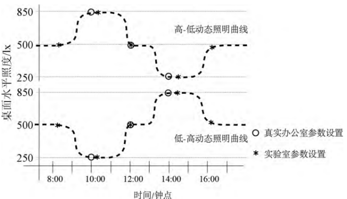 相关研究揭示了人工照明对VDT作业者绩效的有益影响,如持续注意力[9,28,29]、复杂脑力任务[21]、视觉绩效[10,52]和工作记忆[28,29]。照度和色温作为人工光环境的重要属性,两者影响VDT作业者绩效的交互作用被研究人员注意到。Taotao Ru等[28]人的一项研究对比了57名VDT作业者(男=19,女=38)在照度(100lx/1000lx)与色温(3000K/6500K)组合光环境下的精神运动警戒、go/no-go、Eriksen flanker和工作记忆任务绩效,结果表明照度和色温之间没有显著交互作用,VDT办公室人工照明的色温对持续注意力、抑制无关信息和工作记忆的影响程度小于照度。此外,Sithravel等[39]的研究显示在不同的时间提供不同的照度水平可能会有效提高VDT办公室员工的工作绩效,这证明了探索动态照明模式的重要性。针对VDT办公室的动态照明曲线,Seyyed AZ等[52]提出在电站控制室等需要轮班的VDT作业场所,应在每个轮班的末期时段增加桌面照度水平,以防止因嗜睡[58]和疲劳[59,60]出现错误和意外事故。M.B.C.Aries等[23]则建议不能直接将实验室环境得出的动态照明曲线应用到真实办公环境,其对比了模拟实验室和真实办公室中各20名被试在两种动态照明模式下的空间可视化能力和注意力,如图3所示,结果显示真实办公环境与实验室所得结论不一致。