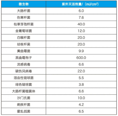 现有研究结果表明,在达到相同的灭活率时,不同微生物对应的紫外剂量存在较大差异。藻类和原生动物所需的剂量较大,其次是霉菌孢子类。细菌和病毒基本在紫外剂量较小时,就已被完全灭活。了解微生物灭活的紫外剂量,有利于紫外消毒设备实现更大的灭活率,为进一步研发创新奠定了基础。