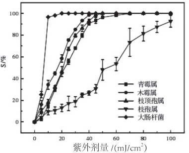 图2 紫外灭活四种真菌及大肠杆菌的差异性[19]