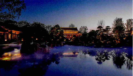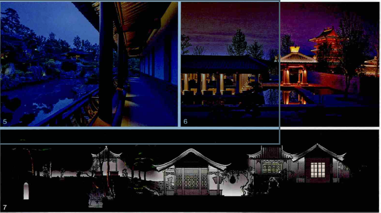 现代的灯光设计讲究与建筑等载体一体化设计,灯光是建筑的一部分,用灯光塑形尊重结构逻辑和空间需求。同时,满足作为开放观览的园林的可观赏性、戏剧性,也是经营方式的需求。从传统习惯看,屋顶是不会专门照亮的,现代园林为了大场景需求有时会把屋顶装饰性地照亮,主要目的是为了营造远视点上的繁华景象。