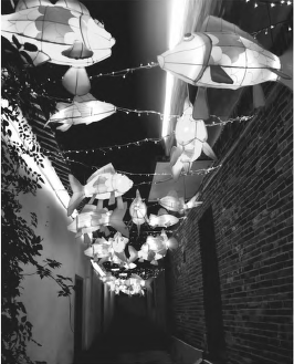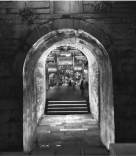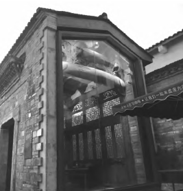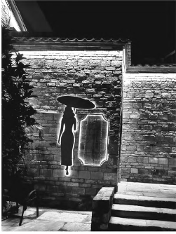 传统巷弄中往往会根据景观的需要和空间秩序的安排在局部区域设置小品以增添趣味。夜景照明与这些小品的巧妙结合往往会营造“意外”欣喜的效果。小品的设置宜选择在巷弄中的凹区或宽巷与窄巷的转角处(窄巷墙体上)(图10和图11),当游客在宽巷中漫步到转角处的不经意间眼前一亮,这样可以打造“移步换景”、“处处新奇”的浪漫美妙和戏剧性的效果。需要注意的是小品的投光要注意两点:一是尽量避免给游客造成眩光;二是若其上有文字,则宜将文字用光映衬便于游客了解街巷的文化,同时实现更美的效果。