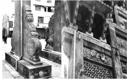所以对牌坊的照明设计非常值得研究,严州古城自宋朝以来共有130余座牌坊,可见其历史地位,但保留下来的较少,现存牌坊多是在2018年以来全省美丽城镇建设中复建而成。笔者通过对多个古镇古街调研情况来看,目前牌坊亮化手法存在一些通病:一是牌坊“过亮”,在照明设计中采取“通亮”的方式,未体现牌坊的艺术美感;二-是投光缺少“着力点”和“侧重点”,未体现牌坊的文化内涵和价值精神;三是线路、控制器和灯具过于明显,尤其在白天显得杂乱(图17);四是夜晚存在“眩光”问题。针对这些问题,笔者提出以下解决方案:一是针对狭小街巷上的牌坊,牌坊周边往往会有古建或较高绿化沿街排列,对于该布局,宜选择在周边建筑相对隐蔽处安装投光灯打亮牌坊,投光灯宜安装在地面以上3m左右,但要注意控制光束角以取得最佳投光效果,宜借助绿化适当遮挡多余的光,且应在牌坊周边区域(尤其是沿街轴线方向)测试避免游客眩光,选取最佳投射位置和角度,所强调的点位应是最能代表该牌坊文化和艺术价值的区域如坊名、人物花鸟等浮雕;二是针对广场等开敞空间周边无建筑或树木安装投光灯或遮挡不足“漏光”导致眩光的牌坊,宜采用在牌坊主体上直接安装灯具投光,但须采用“极小”体积灯具,且应斟酌投射面,布线尽可能采用仿真“爬藤植物”方式隐蔽,采用该方式投光切忌“通光”,仅在重要区域如坊名、花板、浮雕、柱体根部等投光,安装时需不断测试以取得对灯具、线路最大化隐蔽,同时避免眩光。