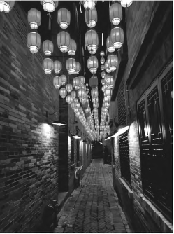 ②当2m≤B<5m。此区间“街”已变为“巷”,檐口内侧可安装洗墙灯形成舒适的空间感,但屋面瓦面灯不建议安装,主要原因是空间压缩后亮度不宜过高,另外考虑到人行走在巷中的视线感,如安装瓦面灯则容易让行人产生“压迫感”。在此尺度上,马头墙建议采用极小功率灯投光,投光面积约50%即可(图7)。巷两侧灯笼和跨街灯伞可用来衬景(图8)。对该尺度巷来说,在纵深方向形成错落有致、精致典雅的“小景”较为重要,但要注意色彩协调。