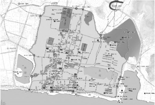 在古城夜景设计中,要力争将光作为引导游客集散的工具,光的布局应与古城规划人流动线有效衔接呼应[5],应精心安排。严州古城着重打造的是城南核心区,重点是三星街——东门街、正大街——南大街两条十字轴线以及中轴线两侧的东湖、西湖,即两线、两湖布局(图25)。对于两线上的古街,用暖色投光灯、特色文化标识灯笼让游客回味古城的记忆,游客在古街上玉带河灯光的引导下会来到东湖和西湖,感受时尚带来的“脉动”,当游客继续沿着中轴线(正大街——南大街)走到最具标志的南端澄清门时看到古城墙巨幅投影时产生了观感和情感上的升华,内心受到震撼,这些在严州古城都是通过光的布置加以实现(图26)。