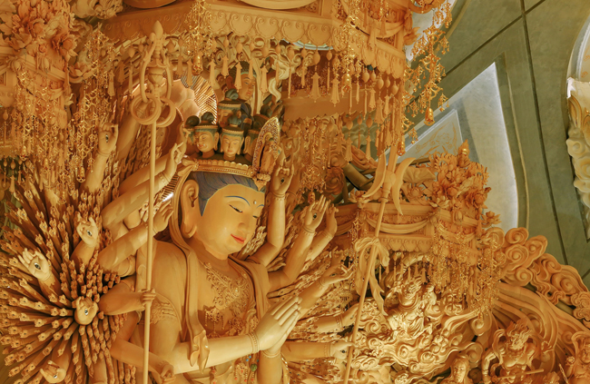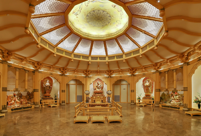 须弥山内部圆通大厅,为圣坛重要的信众活动场所,也是目前面积最大的穹顶佛教场馆。圆通大厅空间宏大,结构布置规整一(底部为24个立柱门头、从下而上每层24尊佛像),材质色调统承载游客、信众及倍侣的游览、参拜、礼佛、会议等多使用需求。大厅正对面为组巨大的千手观音组雕,宽19米高11米,整体由加拿大特级黄桧雕成;四周环壁共九层,由清水混凝土体浇筑完成,每个环壁壁龛内供奉尊彩绘毗卢观音造像,共216尊;混凝土往上延伸为仿木纹的铝合金结构,每个单元由菱形结构及双曲防火玻璃组成,整个铝合金结构延伸至8层顶部天花。