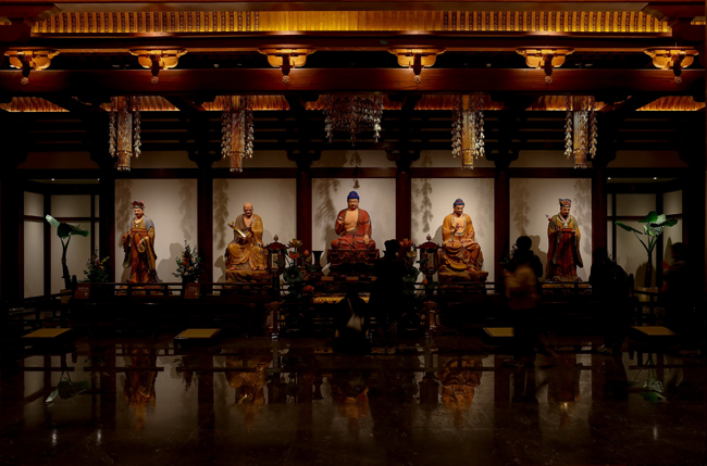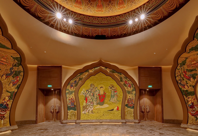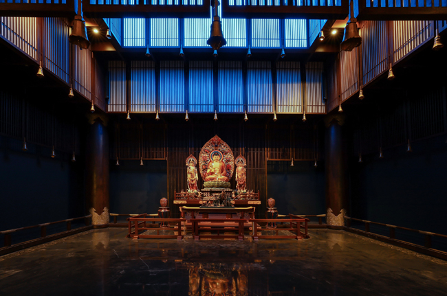 六至八层为传统的佛教文化展示空间,通过中国不同历史时期的观音文化、以及国内外观音文化的发展,来展现观音不受形态、时间、地域的限制,呈现佛文化的深度和广度。佛殿空间采用藻井、斗拱、汉阙等大量传统建筑手法,灯光通过丰富的类建筑照明的手法,来呈现不同时代、不同地域的建筑风格特色,营造神圣的佛教空间氛围。