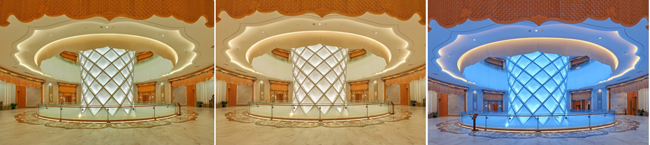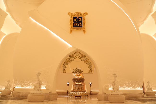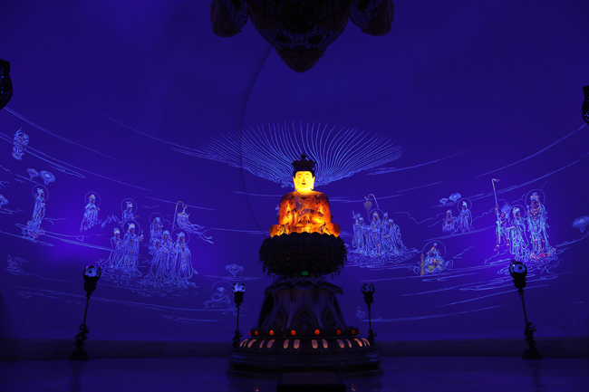 九层正法光明阁为圣坛重要的精神空间,整体结构犹如朵白净的莲花花苞,花苞内中心供奉正法明如来,照明设计结合玉佛的材质特性采用内透结合外部投光的方式实现整体照明;花苞内墙面绘有三十三天和二十八部众佛荧光画,采用特殊定制的380nm紫外灯具来激发荧光画。此空间结合音乐设置灯光演绎场景,灯光由暖色暗氛闱到紫光氛围再到白光的大放光明的动态变化,体验次关于受佛陀感化到光明普照的心理历程。