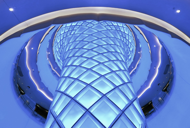 大厅上部为双曲铝合金结构和磨砂双曲防火玻璃,须弥山的设计理念为“引入天光“,作为一体化的装饰结构,铝合金灯光氛围需要营造较强的天光效果,以及动态演绎时升腾变化的灯光效果,所以铝合金架构区的灯光设计难点主要体现在以下几点: