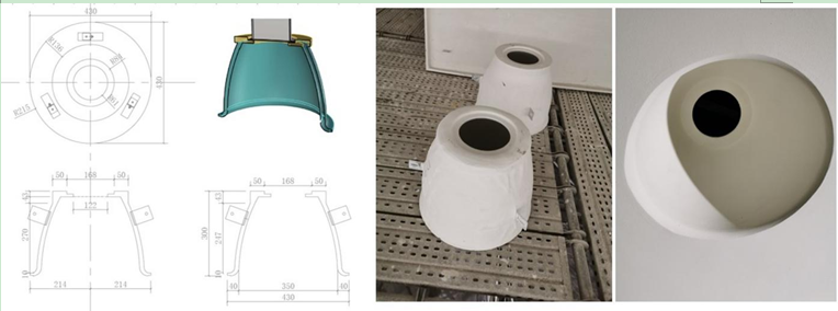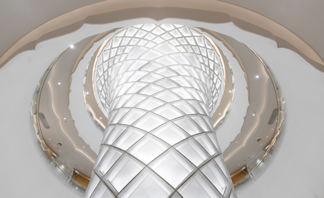 挑空区基础灯具采用深防眩、高显指设计的定制石膏灯,即在射灯基础上增加白色石膏模,空腔多次反射后出光,可有效控制高空直视眩光,同时隐藏光源;石膏模与灯具为分体式设计,石膏模采用内凹式白色GRG作为反射腔,外表与天花顶部无缝拼接;灯具独立安装千石膏模背后的金属卡件,可从背后天花进行独立安装和检修。