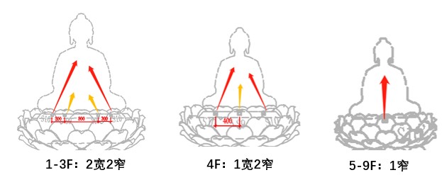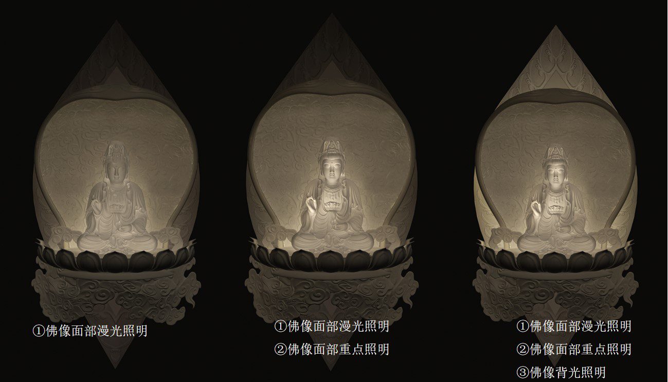 -九层环壁每一层有24个佛龛,每个佛龛内均有一座毗卢观音坐像,总计216套,佛像的照明既然兼顾整体空间氛围,突出佛龛及造像本身,又需要刻画佛像细节,保证佛像的庄严和造像工艺的精湛。设计师通过3D建模进行分析,针对佛像采用不同层次的打光,并进行整体光效研究分析,在保证最优造像呈现效果的情况下,选择了四个层次进行照射,即佛像面部基础光、佛像面部重点光、佛像背光色彩、佛龛环境光。
