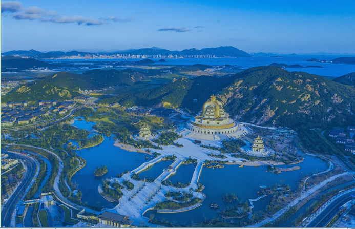 观音法界坐落于中国浙江省舟山群岛朱家尖白山山麓,包含观音圣坛主体、观音村(居士学院)、正法讲寺、佛学院、观音公园多个功能单体群落,总建筑面积约30万平方米。项目旨在打造“经典难忘、举世无双”,集文化体验、艺术展示、文化交流以及观光服务等功能于一体的观音文化主题博览园,其中观音圣坛是观音法界的核心标志建筑,建筑群形态为“一主两从”品字型,圣坛主体建筑总建筑高度91.9米,建筑总体量达到61900平方米,建筑直径150米。