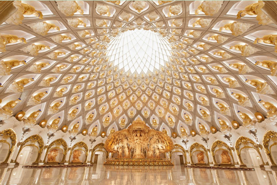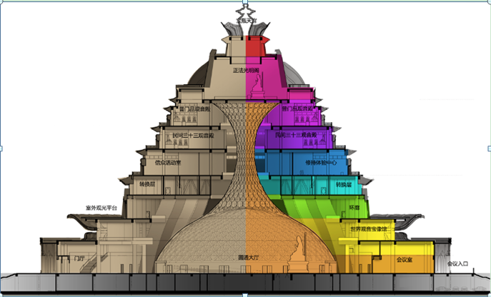 主体内部共九层空间,中庭空间首次提出以佛教“须弥山”作为内部空间形态结构,贯通一层至八层公共环廊空间。本次公共空间包含须弥山整体及公共环廊区域。须弥山底部直径约49米,高度约57.5米,采用清水混凝土结构与双曲铝合金玻璃结构相结合的创新工艺手法。须弥山内部—圆通大厅,为圣坛重要的信众活动场所,也是目前面积最大的穹顶佛教场馆。