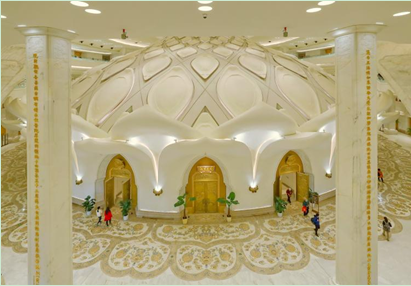 进入圣坛室内即为一个挑空的环廊空间,中庭为室内主体结构须弥山,室内装饰以米白色的石材、GRG为主基调。针对开阔的公共游览空间,灯光需要满足基本的安全照明,同时挑空区域灯光需要严格控制眩光。延续“引入天光"的灯光规划理念,门厅采用较高照度规划,地面平均照度达到300lx,重点展示区则更高;空间基础光以3000K暧白光为主,立面石材照明以3500K中性光为主。