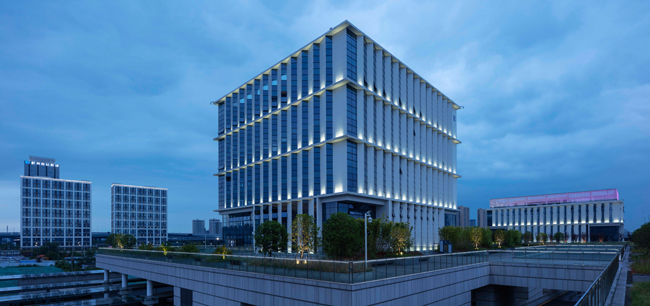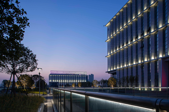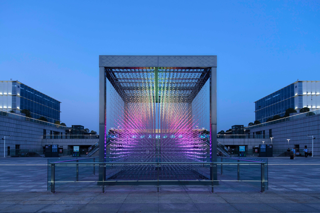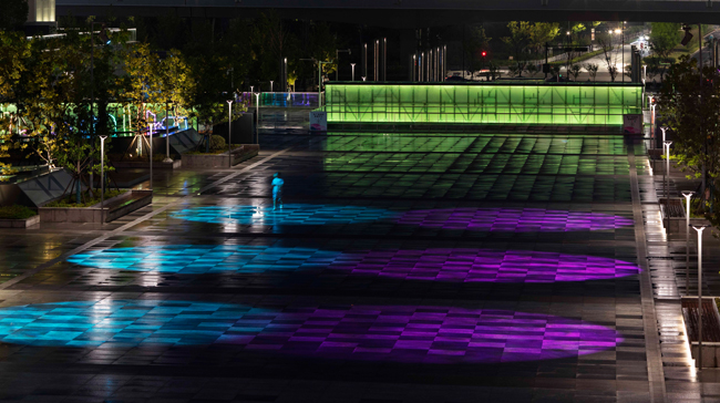 而在两栋近马路的南站产业楼宇顶部,导光板装置透过一定模数的拼接,形成了一组呼应的灯光装置,与广场上的灯光箱体互动连接,形成联动的渐变色。