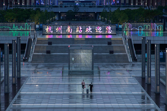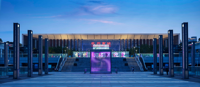 暖白色的灯光晕染出站房的大气,广场周边4幢产业楼宇峻拔英挺,而广场地面上的彩色图案与广场中心的3艺术装置呼应变化,让昔日昏暗的南站变得亲和、生动、活力、时尚,为即将到来的亚运会平添一道亮丽的风景。