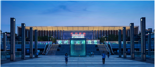而广场周边的产业楼宇顶端设置的光电玻璃墙与广场上的灯光互动装置、投影图案远程智慧联动,实现不同场景、不同模式、不同色彩主题的变化。杭州南站,在灯光的加持下,成为杭州又一独特的门户站点,也成为了杭州迎接亚运的崭新封面。