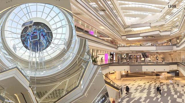 两个大型艺术装制品:AI半机器人“疯眼”和“巨型水母”,突破次元壁界限,现实场景与虚拟世界的结合。AI半机器人“疯眼”偏向于打造视觉焦点职能,再根据装置的吸睛特性进一步做命名延展,以期活化侧方出入口、打造出空间的更多可能性。像素广场的“巨型水母”则从开始的年轻人互动、游戏热点,随着商业主题的扩容,也不断的以多屏呈现的形式与更新的内容呼应。