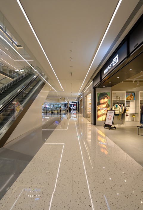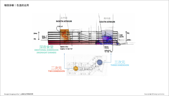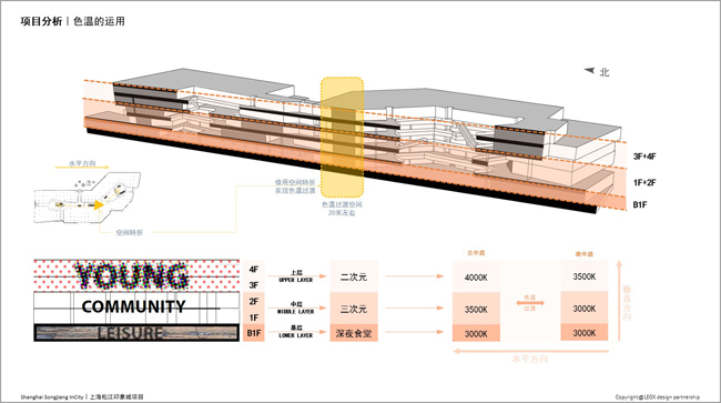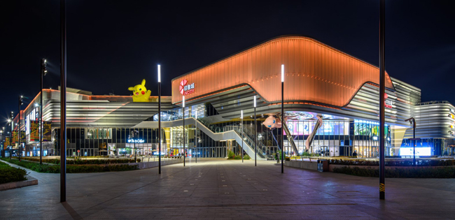 建筑师ECE规划的S型动线,不仅提高平面的整体效率,还迎合了两大核心客群的不同来向,带来双重体验。建筑下部空间及烟火市集(B1F&1F)定位为三次元(家庭与生活),建筑的上部空间(3F&4F)逐渐增加了二次元的浓度,商业和设计也越来越像素化及卡通化。不论外立面还是室内,都采用自下而上,自南而北的二次元至三次元融合,灯光也就如何响应这一主题与相关方进行了深入的探索。