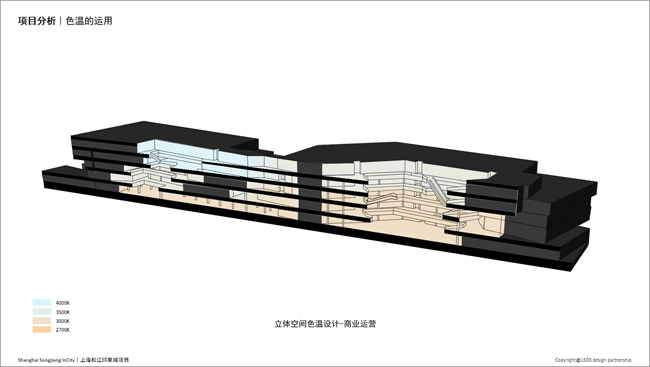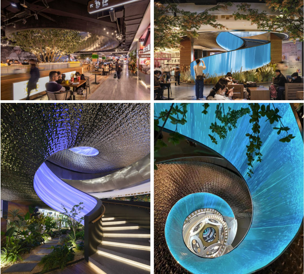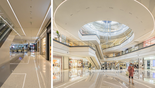 在B1F的开放空间(美食广场)是温暖的2700K-3000K的调子,同时也呼应1F的装置艺术——金色半机器人“疯眼”,1F的主要空间以3000K为主;行至2F,南北侧就会有不同的色温3000K与3500K,业态也逐渐变得更年轻、更数码。这一变化延续到4层,四层北中庭基础照明是最冷的4000K,而主中庭的巨大IP装置“巨型水母”周围配备了6500K色温的极冷的装饰发光板,与极致的科技感互为迎合。
