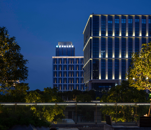 呼应基地所在的广富林区域深厚的考古学积淀,融入了广富林文化遗址中的“层秀”概念,建筑立面通过三种不同颜色的层次变换,打造鲜明、丰富、流动的形象,原设计希望通过洗墙方式表达水平联系,纵向转折的明暗关系,但由于幕墙施工平整度的限制,擦略光照明会凸显幕墙瑕疵,后调整为架设灯杆进行投光处理,有效的缓和了施工上的难题。