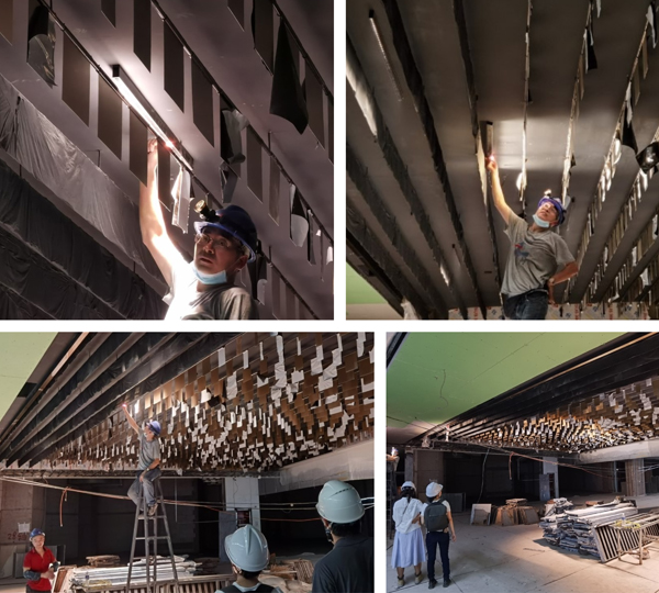 例如风铃特色天花的试验过程,最初的设计从风铃片之间通过宽角度下照线性光提供基础照明的同时兼顾擦亮风铃片侧面,但由于风铃片的高度很小,即使120度的宽光也很难兼顾,而下照灯也会因为数量过多而显得喧宾夺主。