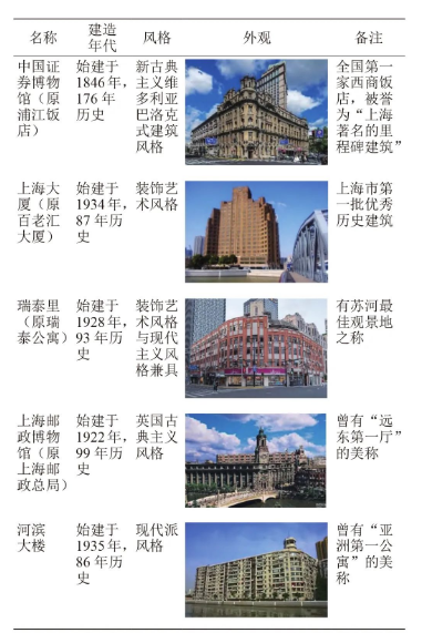 (3)历史保护建筑聚集,风格多样。这一段河岸滨水的第一界面建筑虽然不多,但伫立着在上海城市发展历史上特别有代表性和年代感的历史保护建筑,也展示出不同年代建筑特色鲜明的风格与韵味,如表1所示。这些楼宇无论从其历史文化价值还是景观观赏价值而言,都具有非常重要的地位,其提升改造需要同时兼顾历史建筑保护的相关管理要求、内部使用需求、景观观赏需求等多个方面。