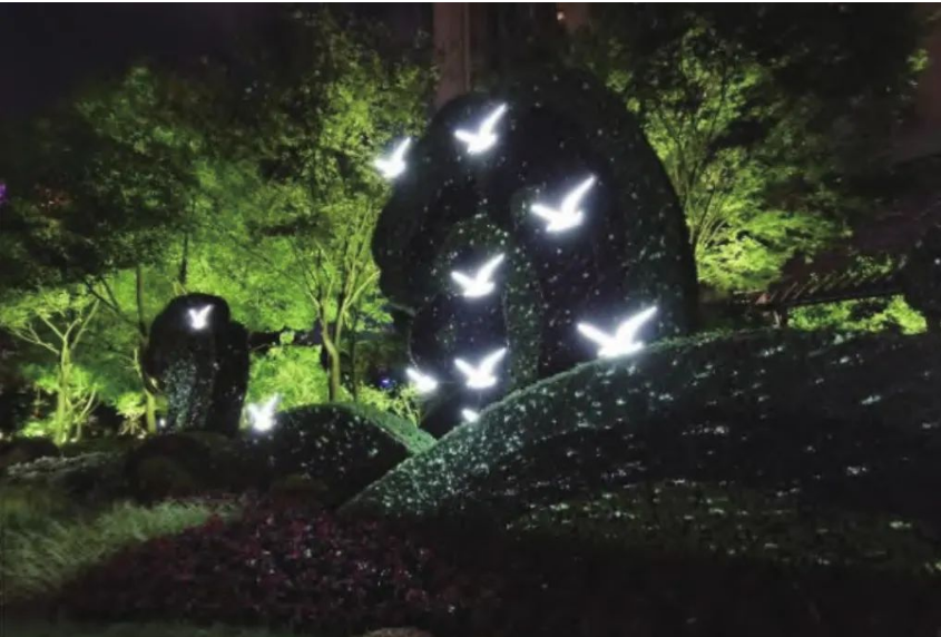 具体设计中,通过研究既有景观存量的特色,结合现有照明设施,取长补短,设计方案同时兼顾艺术性、经济型、可行性等多个维度。以北外滩东大名路上的大型绿雕为例,在保持原有绿雕形态和海鸥形发光雕塑的前提下,采用激光星光投影灯,在绿雕立面投射出如梦如幻的星光闪烁的效果,如图9所示。在夜晚为绿雕披上一层艺术化的光影特效,使其显得更加灵动。整个优化设计灯具安装数量少(3套星光投影灯)、对原有景观载体影响小(采用远距离投射),达到了经济美观的效果。