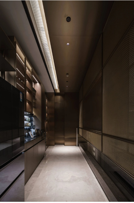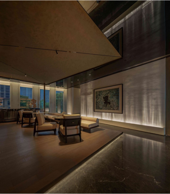 在这里灯光克制而内敛,光源藏于天花板、窗帘盒、背景板中,利用光线和阴影创造更舒适的空间体验。