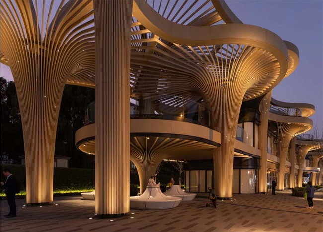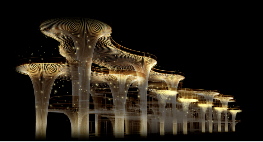 扩散状的伞形顶部能够在远距离外就被看到,走近建筑可以感受到一棵棵“树干”的底部,从下至上散发着温暖的光线。