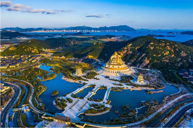 观音法界坐落于中国浙江省舟山群岛朱家尖白山山麓,包含观音圣坛主体、观音村(居士学院)、正法讲寺、佛学院、观音公园多个功能单体群落,总建筑面积约30万平方米。项目旨在打造“经典难忘、举世无双”,集文化体验、艺术展示、文化交流以及观光服务等功能于一体的观音文化主题博览园,其中观音圣坛是观音法界的核心标志建筑,建筑群形态为“一主两从”品字型,圣坛主体建筑总建筑高度91.9米,建筑总体量达到61900平方米,建筑直径150米。