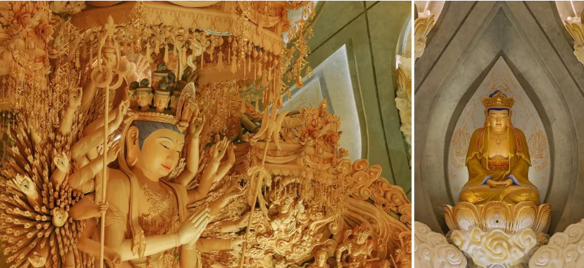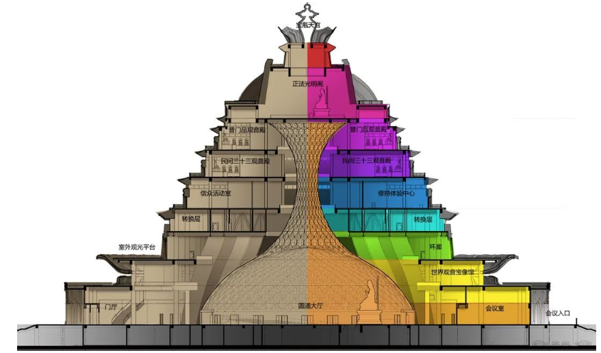 须弥山内部圆通大厅,为圣坛重要的信众活动场所,也是目前面积最大的穹顶佛教场馆。圆通大厅空间宏大,结构布置规整一(底部为24个立柱门头、从下而上每层24尊佛像),材质色调统承载游客、信众及倍侣的游览、参拜、礼佛、会议等多使用需求。大厅正对面为组巨大的千手观音组雕,宽19米高11米,整体由加拿大特级黄桧雕成;四周环壁共九层,由清水混凝土体浇筑完成,每个环壁壁龛内供奉尊彩绘毗卢观音造像,共216尊;混凝土往上延伸为仿木纹的铝合金结构,每个单元由菱形结构及双曲防火玻璃组成,整个铝合金结构延伸至8层顶部天花。
