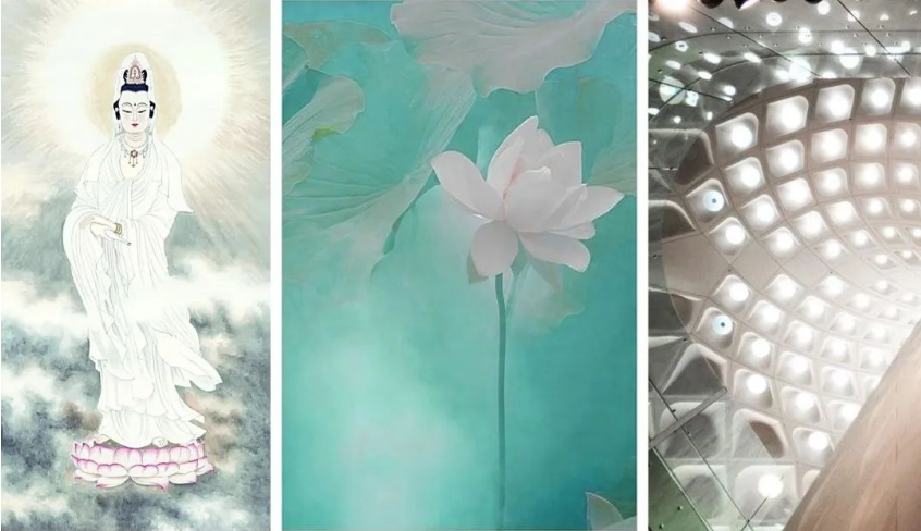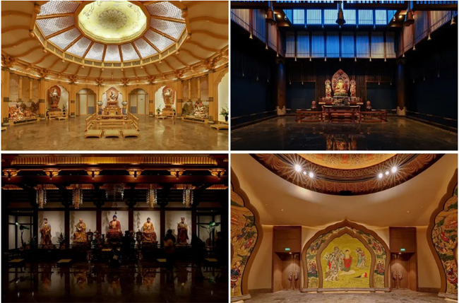 六至八层为传统的佛教文化展示空间,通过中国不同历史时期的观音文化、以及国内外观音文化的发展,来展现观音不受形态、时间、地域的限制,呈现佛文化的深度和广度。佛殿空间采用藻井、斗拱、汉阙等大量传统建筑手法,灯光通过丰富的类建筑照明的手法,来呈现不同时代、不同地域的建筑风格特色,营造神圣的佛教空间氛围。
