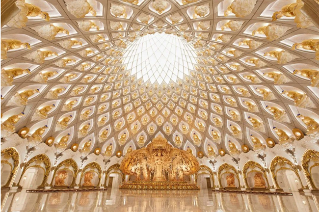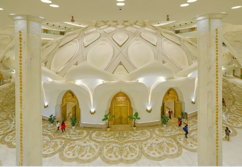 主体内部共九层空间,中庭空间首次提出以佛教“须弥山”作为内部空间形态结构,贯通一层至八层公共环廊空间。本次公共空间包含须弥山整体及公共环廊区域。须弥山底部直径约49米,高度约57.5米,采用清水混凝土结构与双曲铝合金玻璃结构相结合的创新工艺手法。须弥山内部—圆通大厅,为圣坛重要的信众活动场所,也是目前面积最大的穹顶佛教场馆。