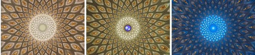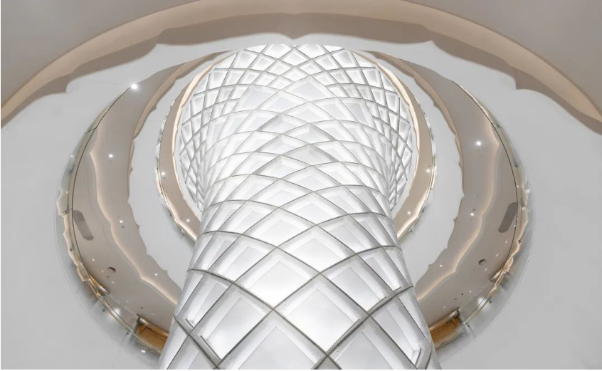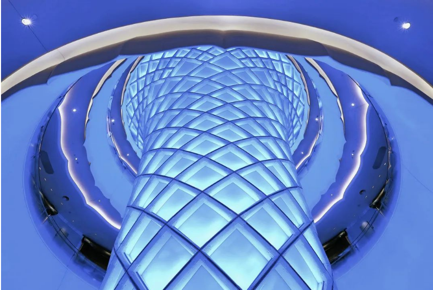 大厅上部为双曲铝合金结构和磨砂双曲防火玻璃,须弥山的设计理念为“引入天光“,作为一体化的装饰结构,铝合金灯光氛围需要营造较强的天光效果,以及动态演绎时升腾变化的灯光效果,所以铝合金架构区的灯光设计难点主要体现在以下几点: