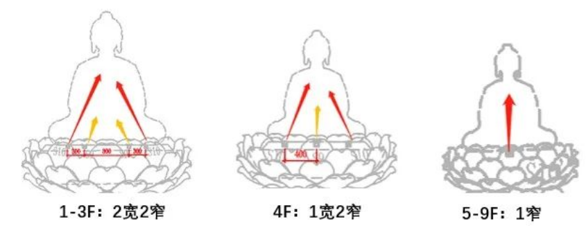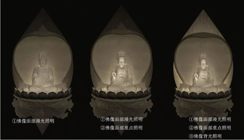 一层-九层环壁每一层有24个佛龛,每个佛龛内均有一座毗卢观音坐像,总计216套,佛像的照明既然兼顾整体空间氛围,突出佛龛及造像本身,又需要刻画佛像细节,保证佛像的庄严和造像工艺的精湛。设计师通过3D建模进行分析,针对佛像采用不同层次的打光,并进行整体光效研究分析,在保证最优造像呈现效果的情况下,选择了四个层次进行照射,即佛像面部基础光、佛像面部重点光、佛像背光色彩、佛龛环境光。